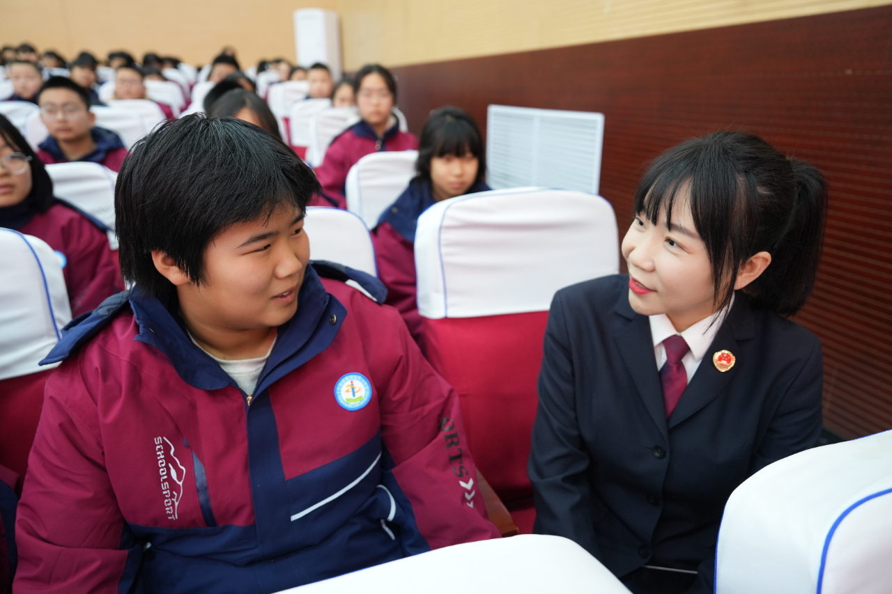 课堂上,周建成检察长结合自身丰富的办案经验,紧密围绕初中生的学习和生活实际,以多起涉未成年人犯罪真实案例为切口,详细讲解了有关防校园欺凌、“拉车门”盗窃等与青少年高频接触的法律风险点。互动问答环节,通过情景再现、角色扮演等形式,瞬间点燃了现场氛围,同学们纷纷举手发言,分享自己的想法,现场掌声与互动不断。“法律存在于我们生活的每一个场景,任何违反法律的行为都要承担相应的后果。”通过这些身边发生的具体可感的事例,同学们得以清晰认知各类违法犯罪行为的本质特征、潜在危害以及可能引发的法律后果,深刻认识到年龄小并非肆意妄为的“免罪金牌”,未成年人的身份也绝不能成为逃避法律责任的“保护伞”,同时也掌握了在遭遇不法侵害时如何运用法律手段进行有效的自我保护。